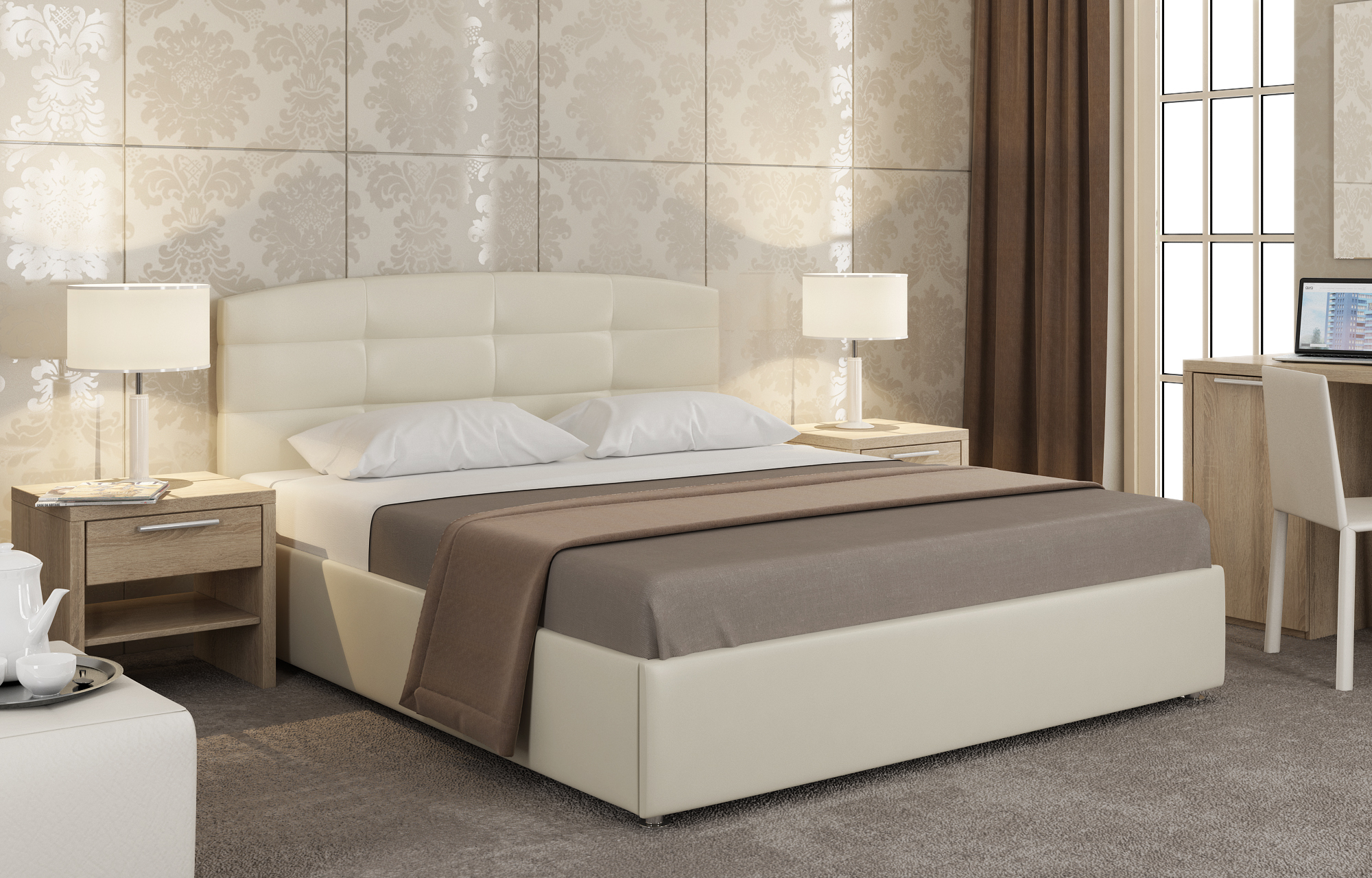 Кровать Mishel. Легкая и белоснежная, внесет в вашу спальню ноты свежести и роскоши. Кровать представлена в обивке из современного экологичного кожзама “Ideal” - она приятна на ощупь - мягкая, эластичная, не выцветает со временем, долговечна, неаллергенна, пропускает воздух, а хромированные ножки отлично дополняют внешний вид изделия.