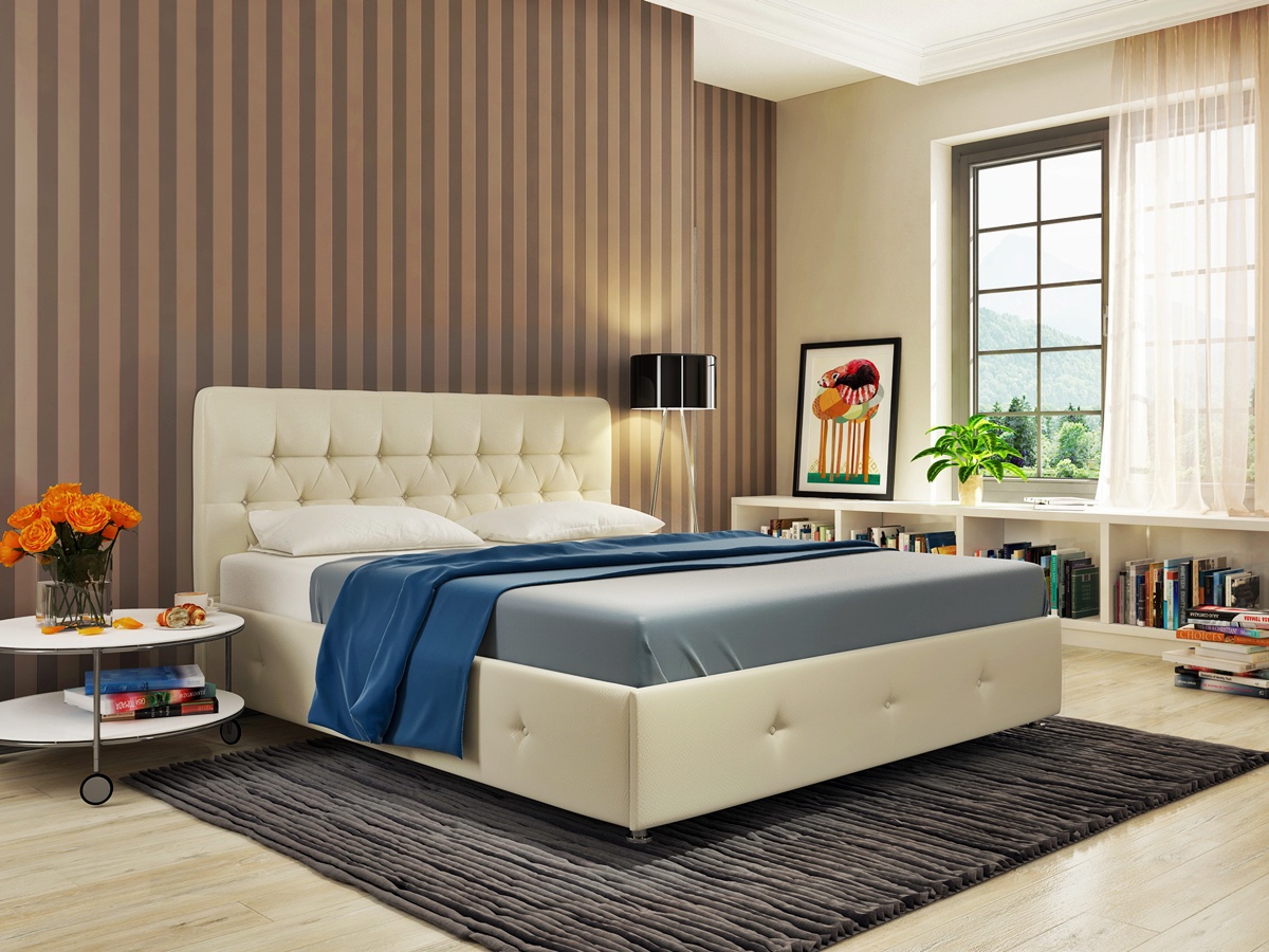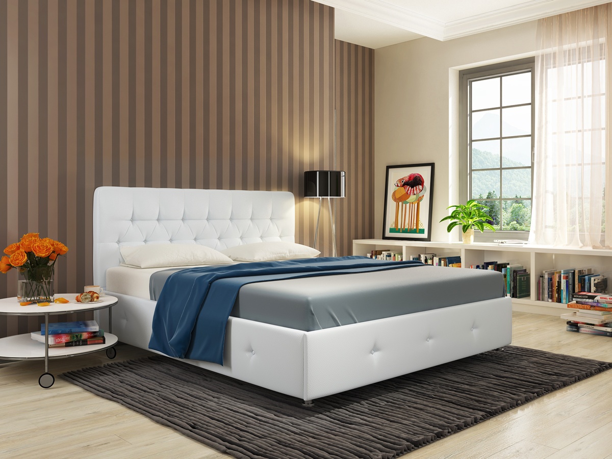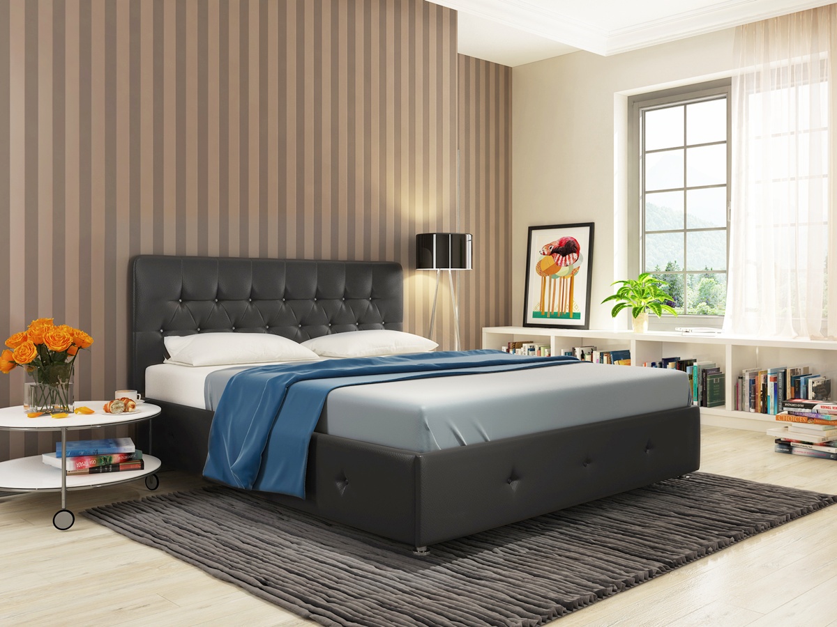 Кровать Афина. Стильная и статная кровать со стразами и глубокой утяжкой. Кровать представлена в обивке из современного экологичного материала “экокожи” - она приятна на ощупь - мягкая, эластичная, не выцветает со временем, долговечна, неаллергенна, пропускает воздух, а хромированные ножки отлично дополняют внешний вид изделия.