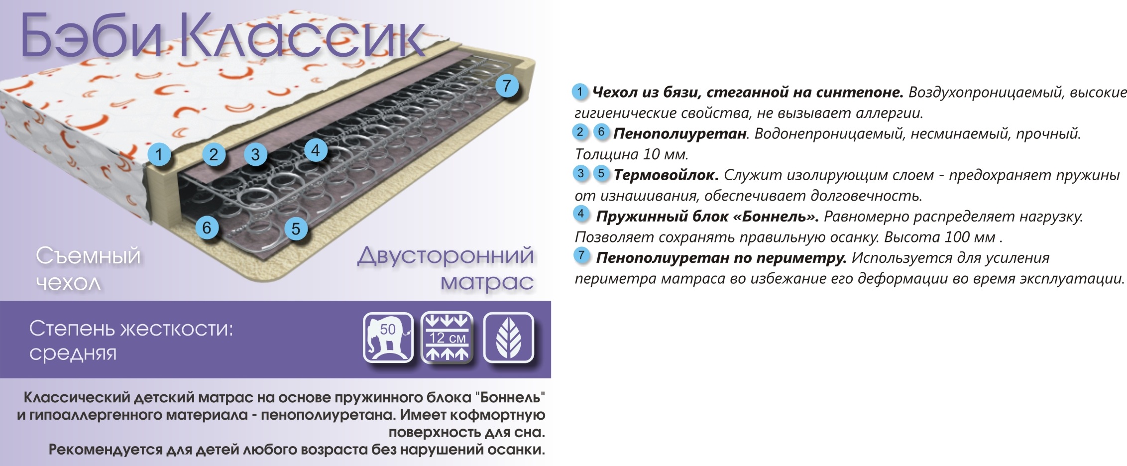 Бэби Классик - средняя жесткость. Классический детский матрас на основе пружинного блока Бонель и гипоаллергенного материала - пенополиуретана. Имеет комфортную поверхность для сна. Рекомендуется для детей любого возраста без нарушений осанки.