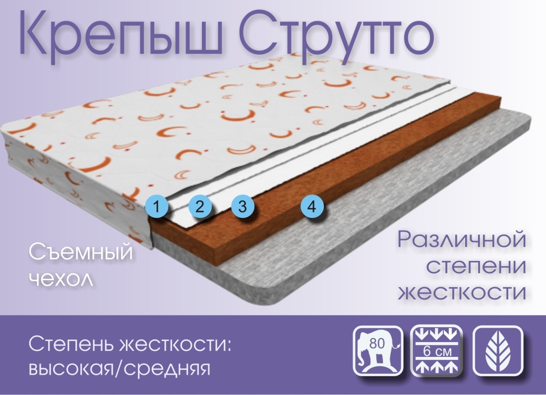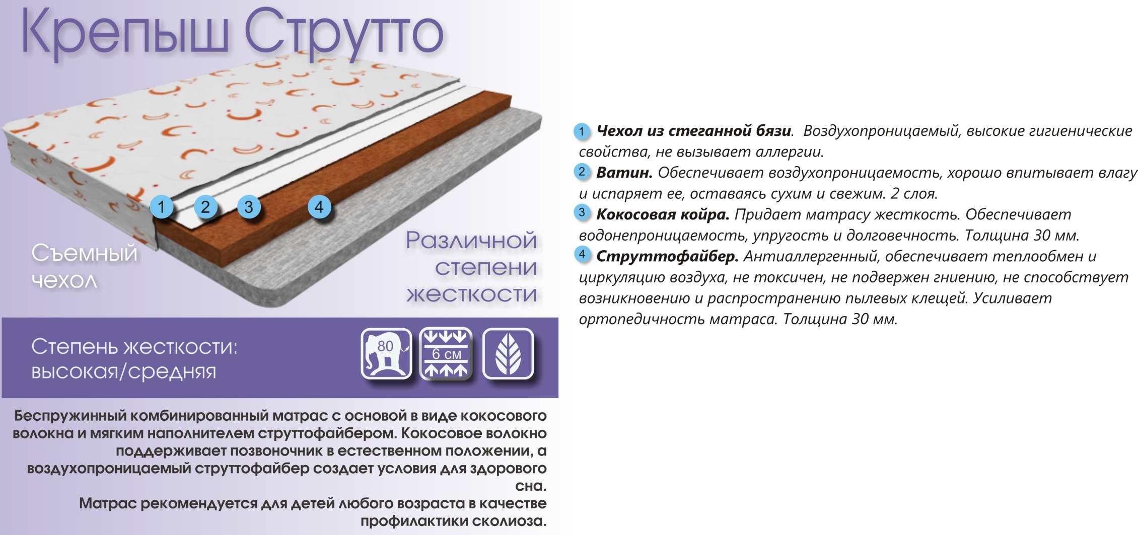 Крепыш струтто - различные степени жесткости. Беспружинный комбинированный матрас с основой в виде кокосового волокна и мягким наполнителем струттофайбером. Кокосовое волокно поддерживает позвоночник в естественном положении, а воздухопроницаемый струттофайбер создает условия для здорового сна. Матрас рекомендуется для детей любого возраста в качестве профилактики сколиоза.