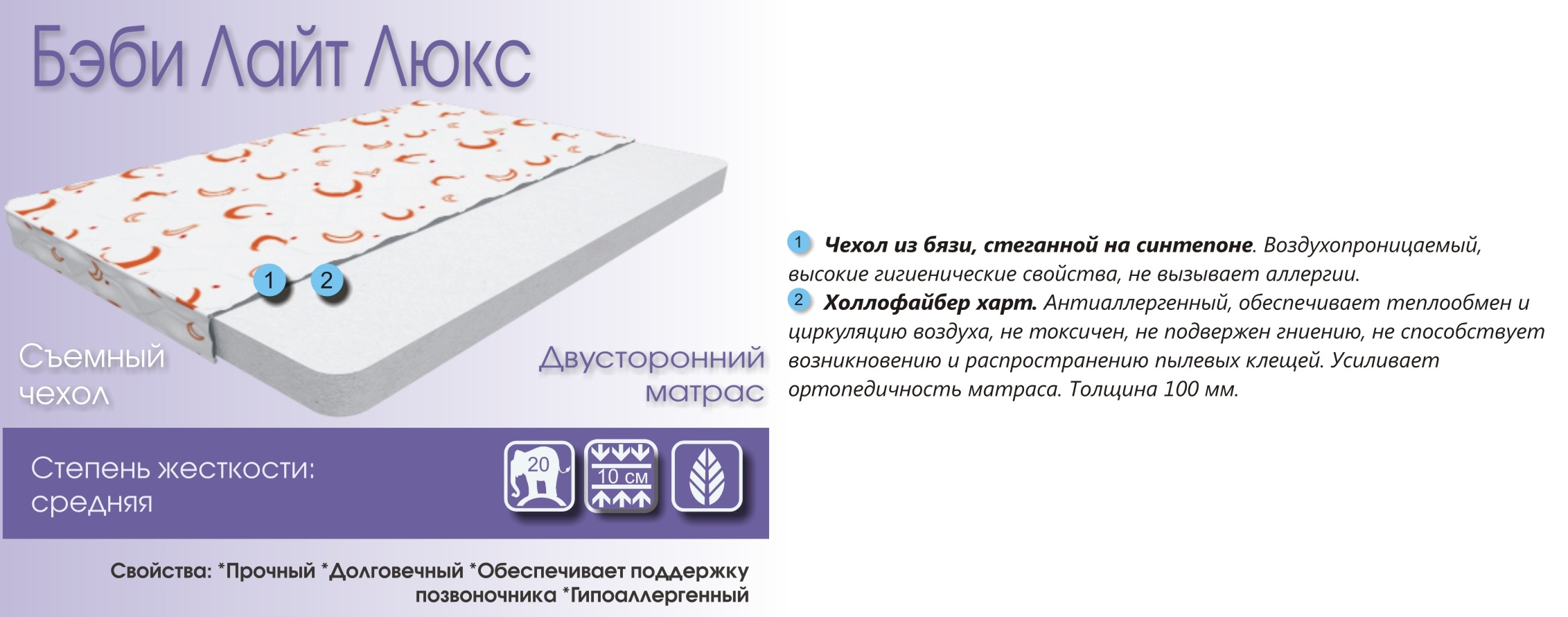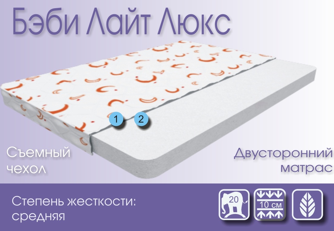 Бэби Лайт Люкс - средняя жесткость матраса. Прочный, долговечный, Обеспечивает поддержку позвоночника, гипоаллергенный.