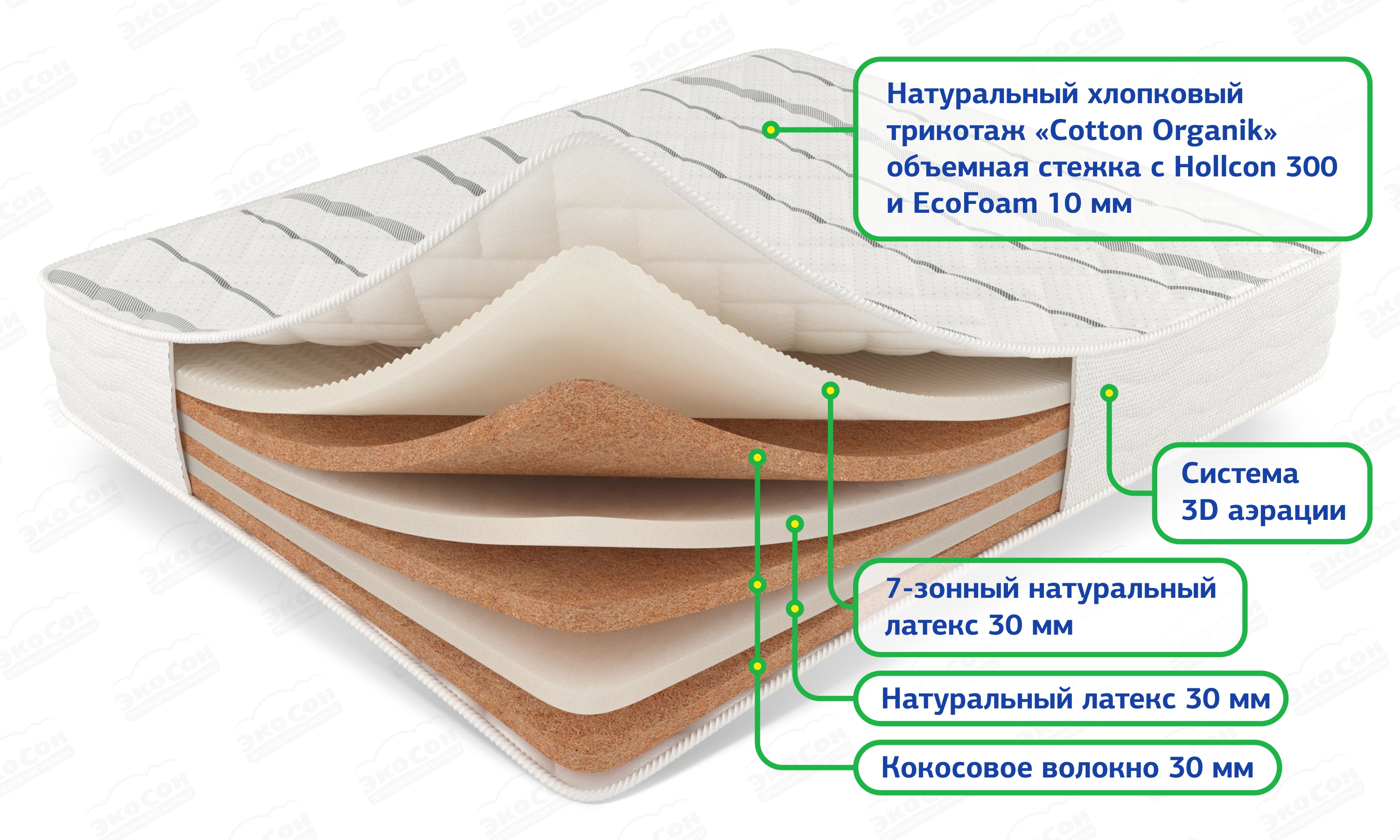 Матрас с разной жесткостью сторон на основе чередующихся слоев натурального перфорированного дышащего латекса и латексированной кокосовой койры. Для изменения ощущений вам достаточно перевернуть матрас. Верхний мягкий слой выполнен из 7-зонного латекса, что создает массажный эффект во время сна и способствует хорошему кровообращению.