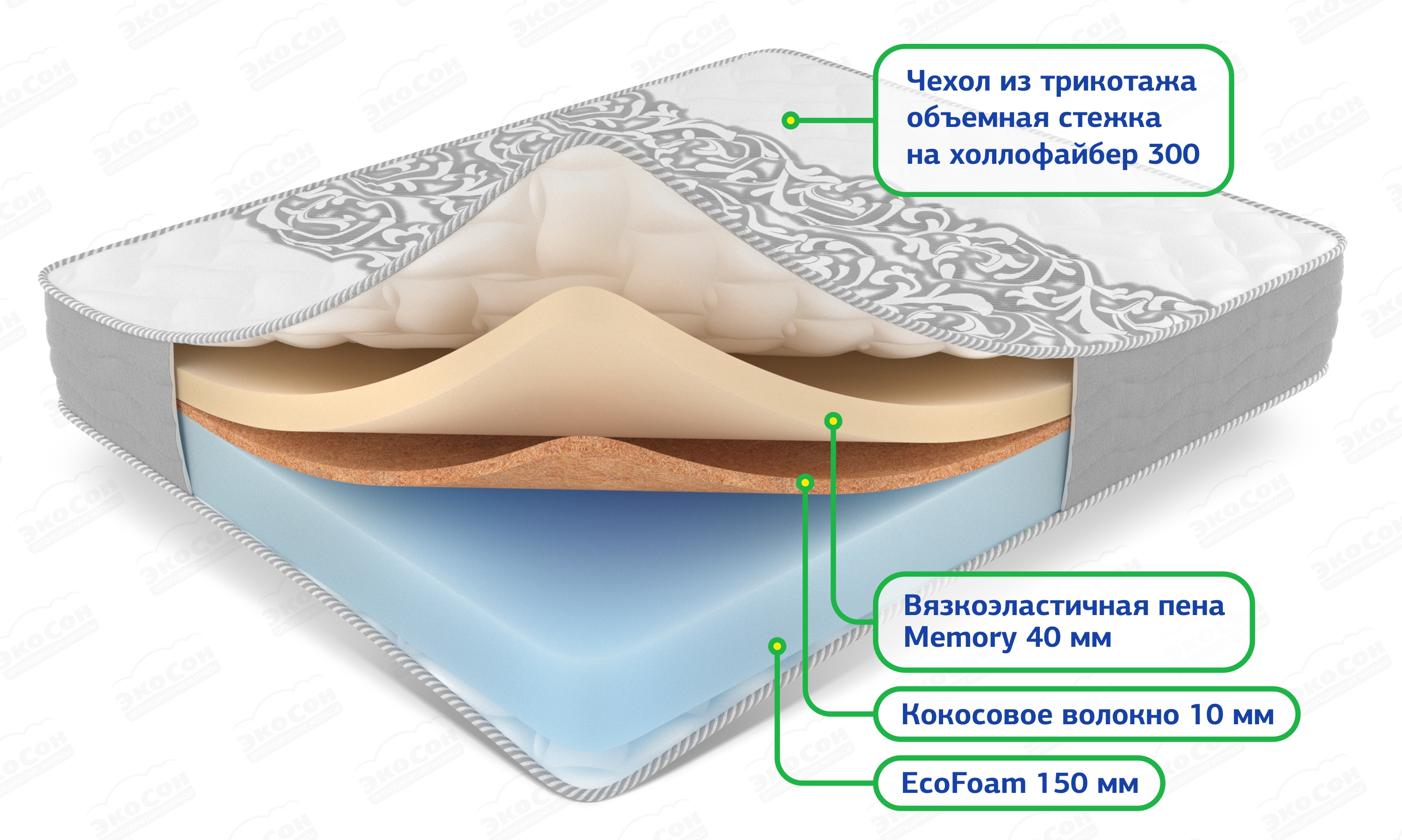 Матрас стандартной высоты Relax Mix сделан из упругой пены EcoFoam и вязкоэластичной пены Memory с эффектом памяти. Для чехла используется практичный трикотаж с объемной стежкой на Hollcon 300. Стороны матраса асимметричны по жесткости и упругости. Модель обладает ортопедическим и анатомическим эффектом, позволяет высыпаться наиболее продуктивно. Пена EcoFoam обладает высокой плотностью и хорошей упругостью. Она отвечает за восприятие нагрузки и поддержку позвоночника. Формирует сторону умеренной жесткости. Уникальная пена Memory Foam обладает вязкоэластичными свойствами. Она подстраивается под силуэт пользователя, не оказывает на ткани тела обратного давления, сохраняет правильное кровообращение. Используется с более мягкой стороны. Оба материала — дышащие, гипоаллергенные и экологичные. Между слоями матрас дополнен кокосовым волокном для предания ровности и жесткости.