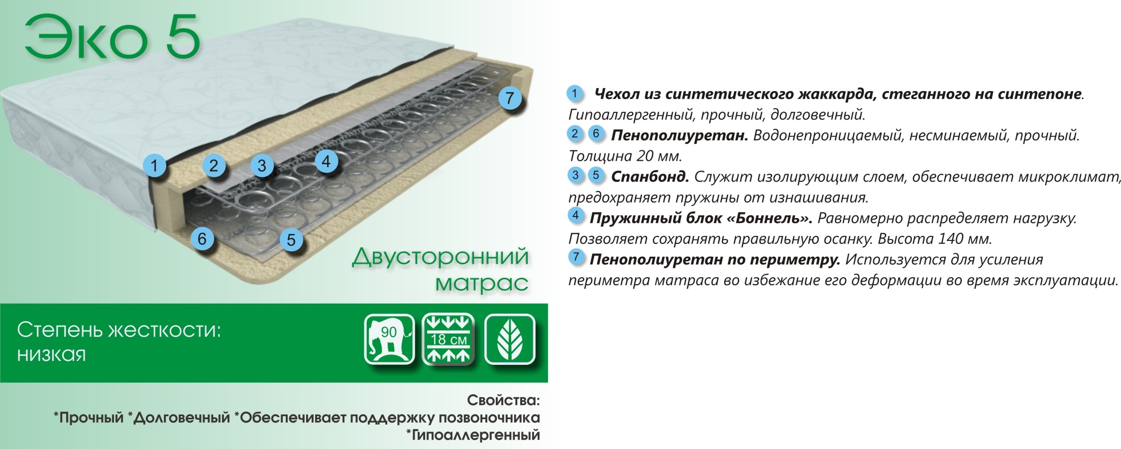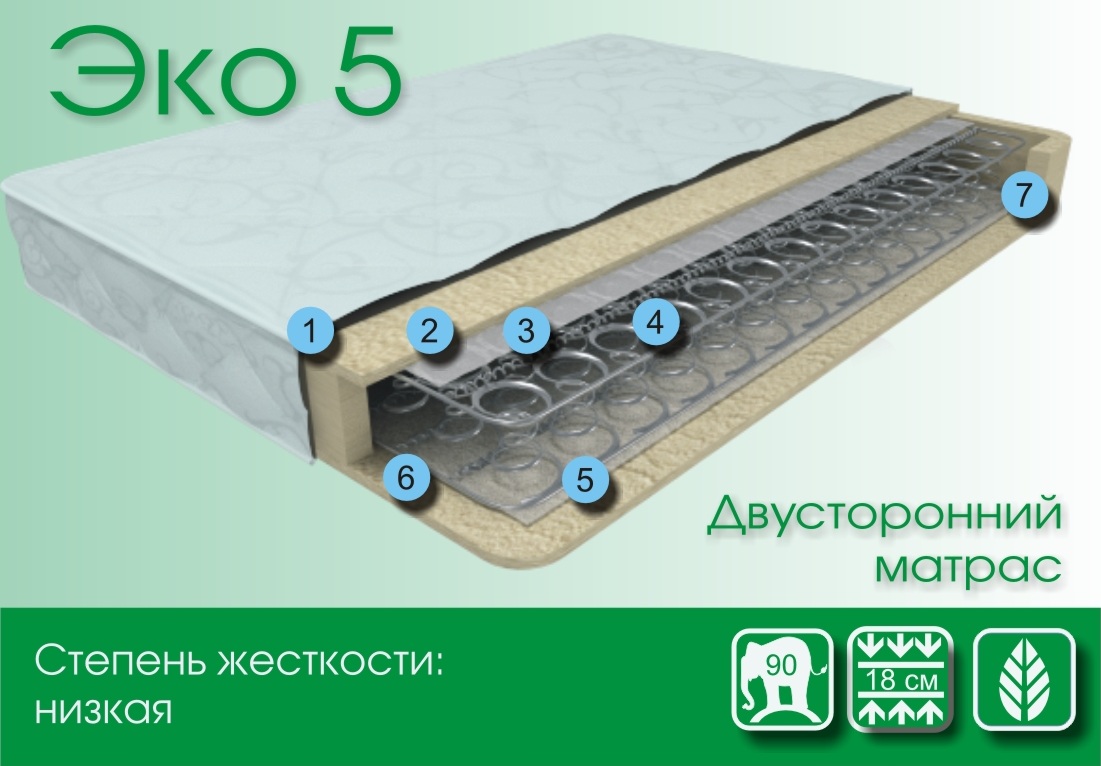 Эко 5 - средняя жесткость. Это матрас является самым простым и долговечным. Обеспечивает поддержку позвоночника и абсолютно Гипоаллеренный