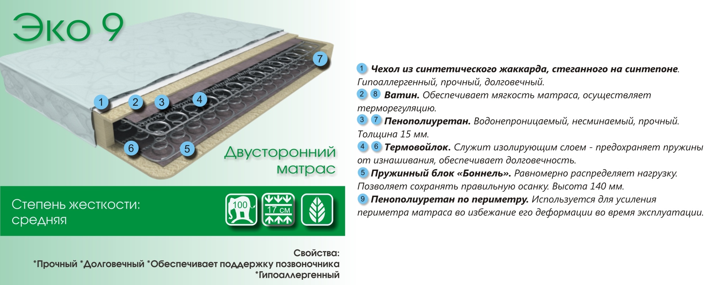 Эко 9 - средняя жесткость. Это матрас является самым простым и долговечным. Обеспечивает поддержку позвоночника и абсолютно Гипоаллеренный