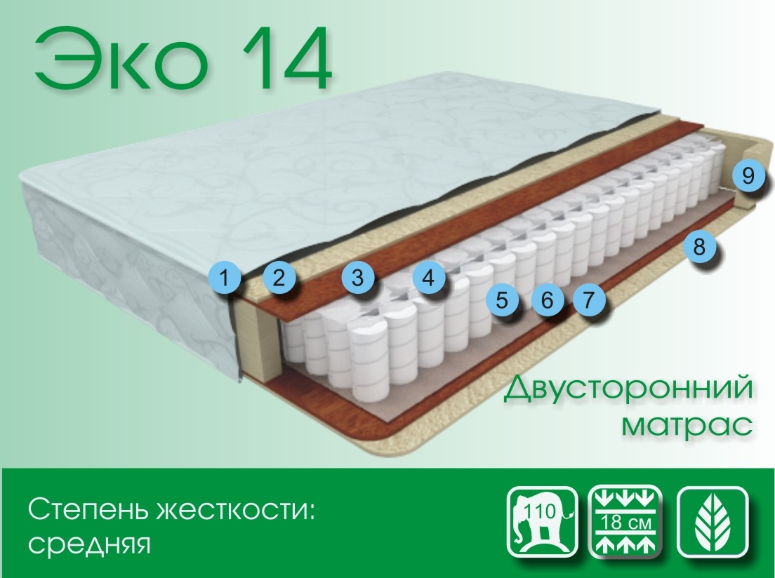 Эко 14 - средняя жесткость. Это матрас является самым простым и долговечным. Обеспечивает поддержку позвоночника и абсолютно Гипоаллеренный