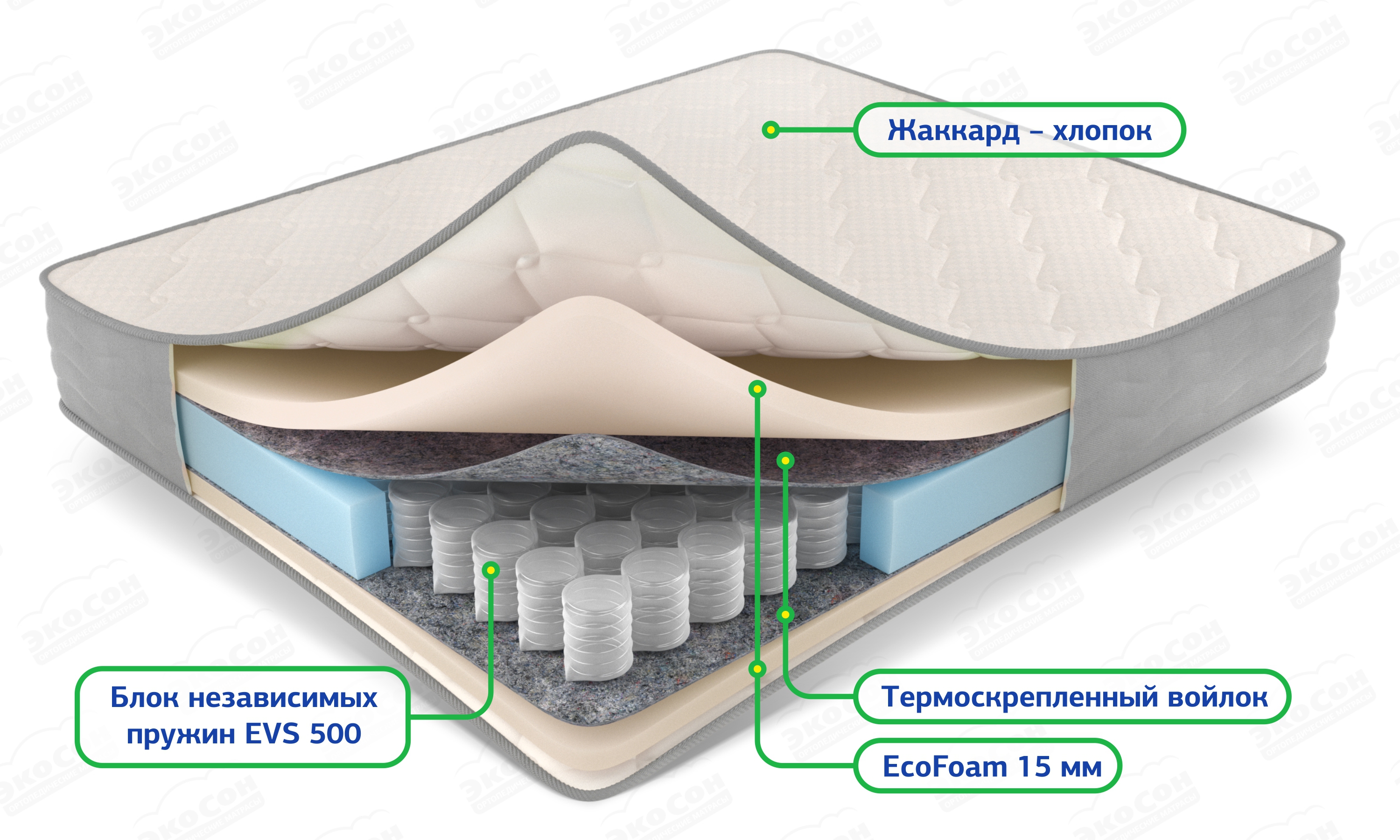 В качестве верхнего наполнителя с обеих сторон используется мягкая эластичная пена EcoFoam. По периметру матраса установлен короб из ППУ, который поддерживает форму матраса на протяжении всего периода его эксплуатации. Чехол из хлопкового жаккарда с высокообъемным бортом из обивочной ткани на ППУ.