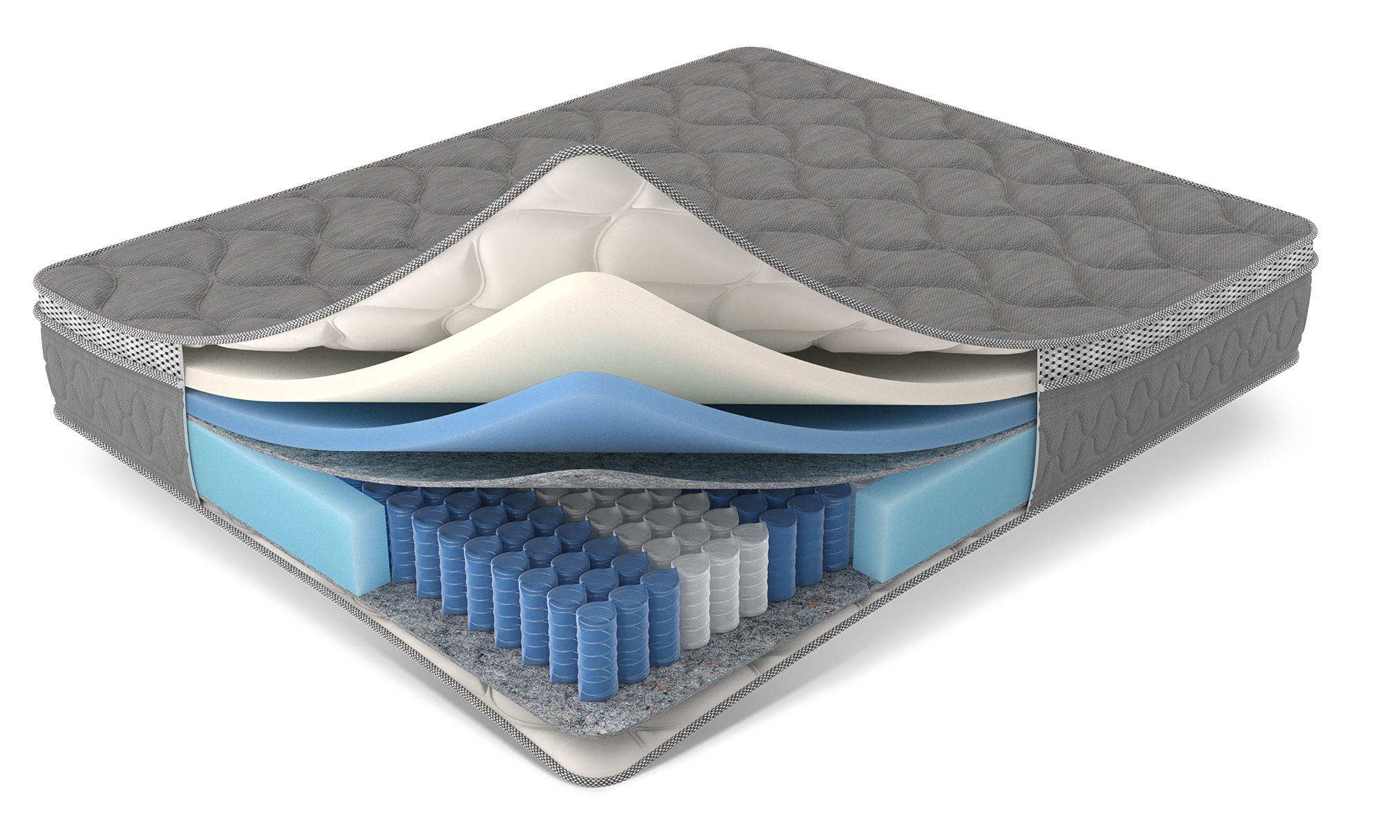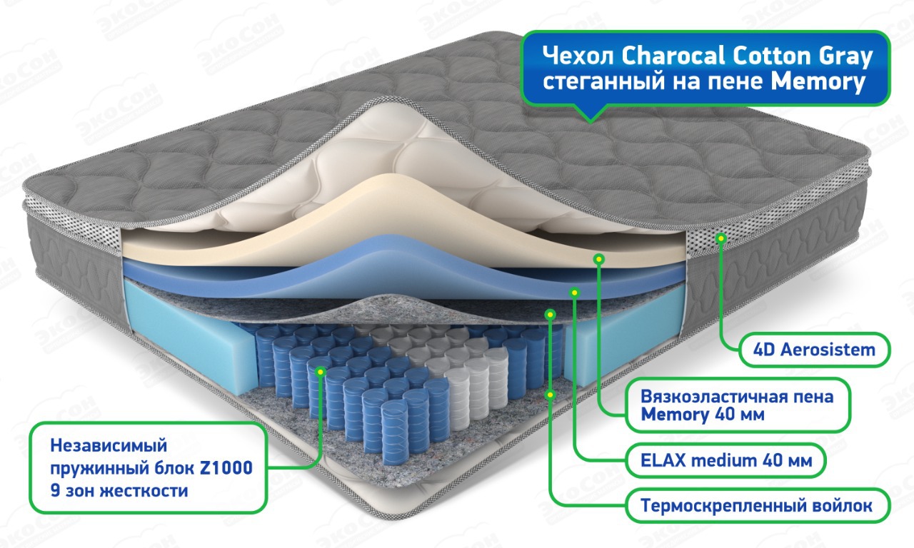 Основа матраса независимый пружинный блок Z1000, 9 зон жесткости, в этом блоке 1000 пружин на спальное место (=500 на кв.м.). Большая плотность пружин помогает равномерно распределить нагрузку по поверхности матраса, снять мышечное напряжение и поддержать позвоночник в правильном положении. Пружинный блок способен выдерживать нагрузку до 130 кг и хорошо подходит парам, чей вес различается не более, чем на 30 кг.