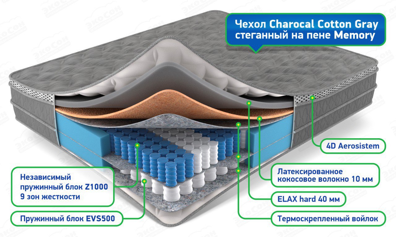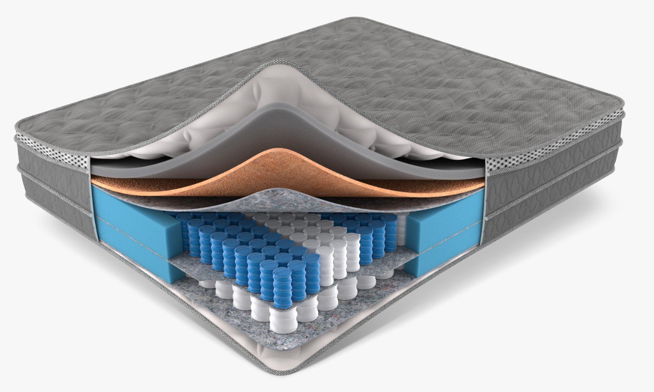 Основа матраса независимый пружинный блок Z1000, 9 зон жесткости, в этом блоке 1000 пружин на спальное место (=500 на кв.м.) и независимый пружинный блок EVS500 (=250 на кв.м.), 5 зон жесткости. Большая плотность пружин помогает равномерно распределить нагрузку по поверхности матраса, снять мышечное напряжение и поддержать позвоночник в правильном положении.