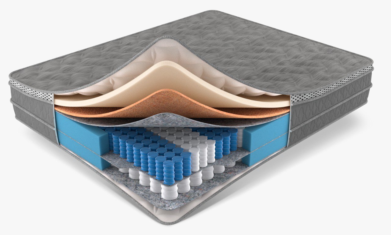 Основа матраса независимый пружинный блок Z1000, 9 зон жесткости, в этом блоке 1000 пружин на спальное место (=500 на кв.м.) и независимый пружинный блок EVS500 (=250 на кв.м.), 5 зон жесткости. Большая плотность пружин помогает равномерно распределить нагрузку по поверхности матраса, снять мышечное напряжение и поддержать позвоночник в правильном положении, а материал Латекс лайт дает ощущение мягкости во сне.