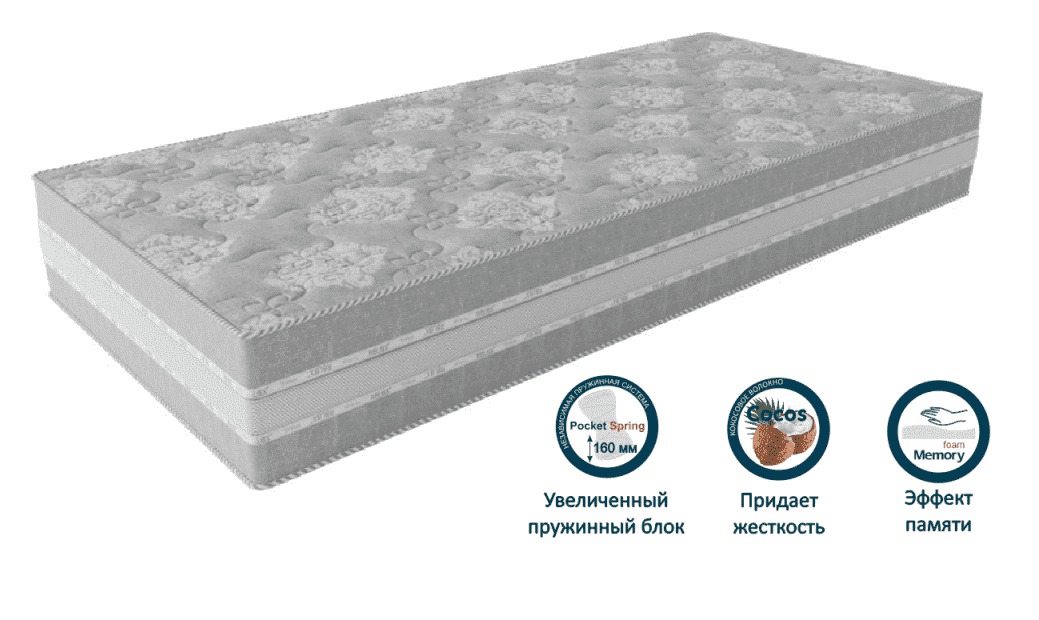 Новинка компании Релакс 2020 года матрас - Гранд Мемори выполнен из натуральных и экологичных материалов. В основе матраса лежит увеличенный блок независимых пружин Pocket Spring – 160мм, обеспечивает оптимальный анатомический эффект и позволяет создать точечную поддержку позвоночника во время сна. С одной стороны матраса используется пена высокой плотности Hard в сочетании с натуральным кокосовым волокном обеспечивает правильную поддержку позвоночника во время сна, с другой стороны используется инновационный материал Memory foam, который способен "запоминать" форму, тем самым создавая эффект "невесомости" и позволяет расслабить все группы мышц.