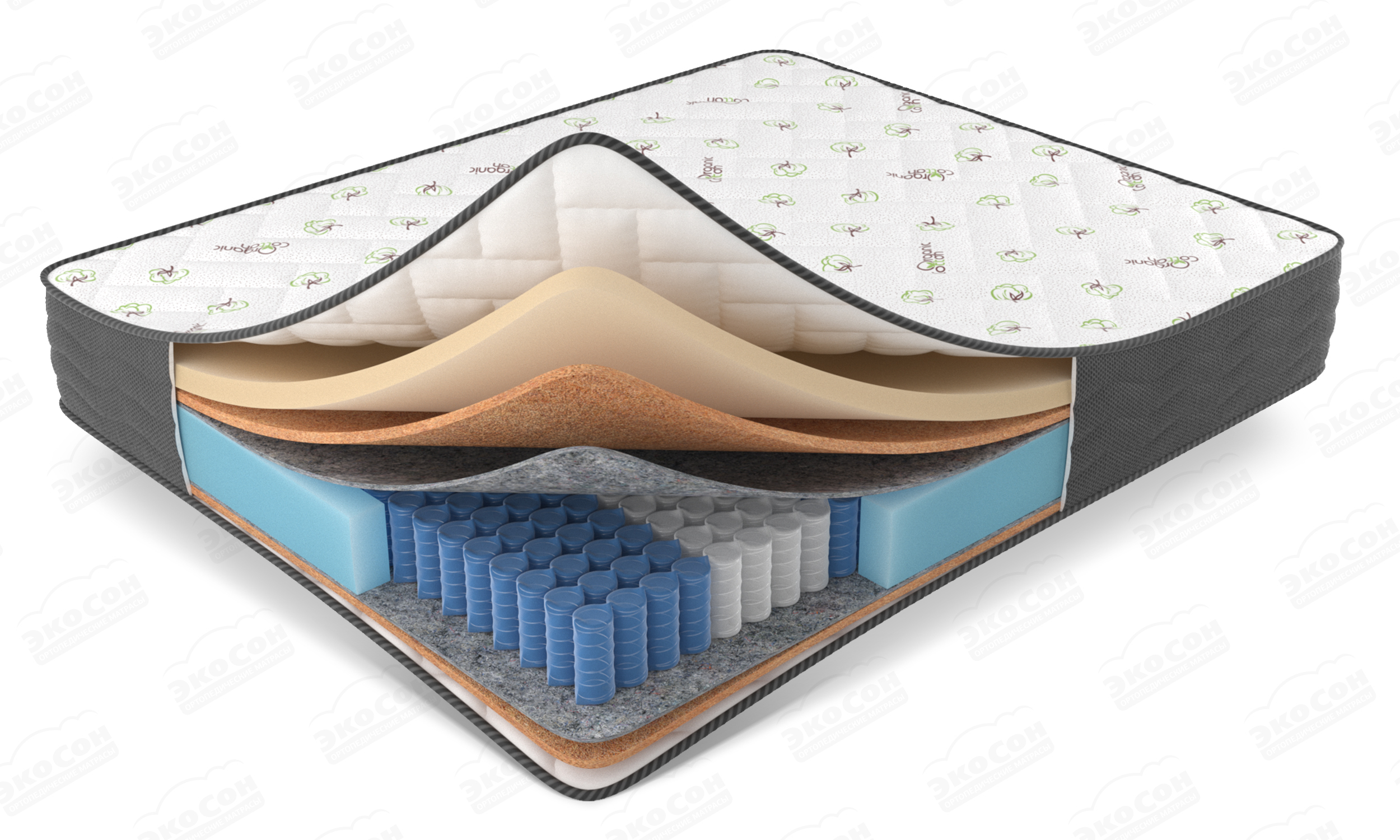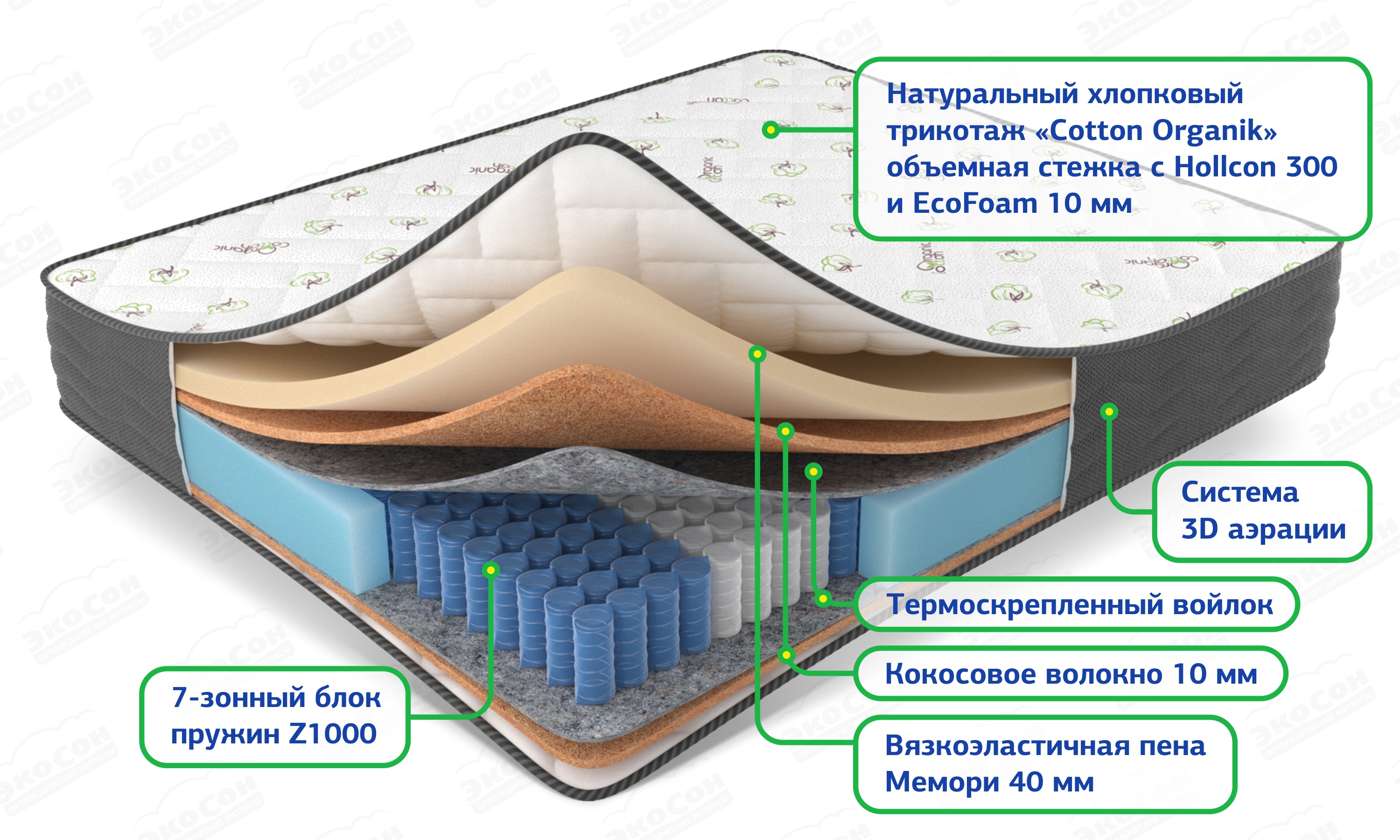 Чехол из хлопкового трикотажа "Cotton Organik" стеганный на Hollcon (300) и Ecofoam (10 мм), высокообъемный борт по периметру 3D Aerosistem