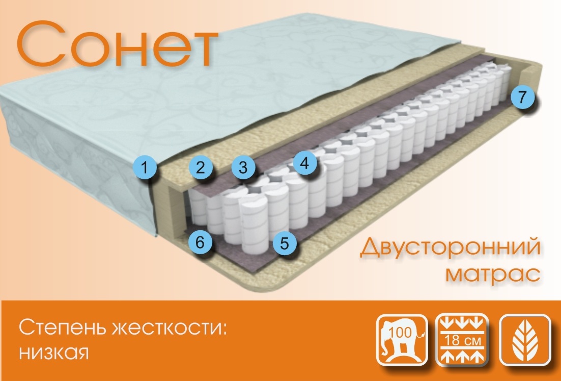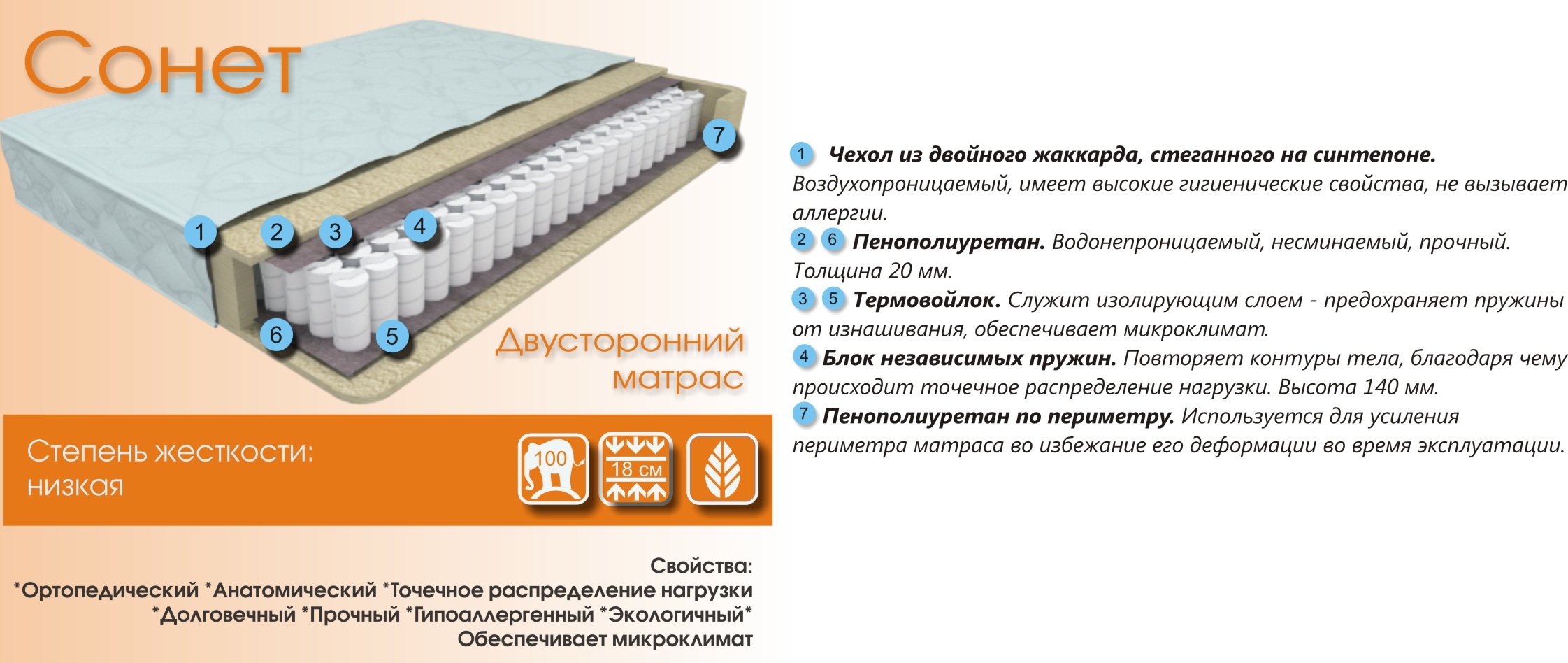 Сонет - жесткость средняя. Ортопедический, Анатомический, Точечное распределение нагрузки, Долговечный, Прочный, Гипоаллергенный, Экологичный, Обеспечивает микроклимат.